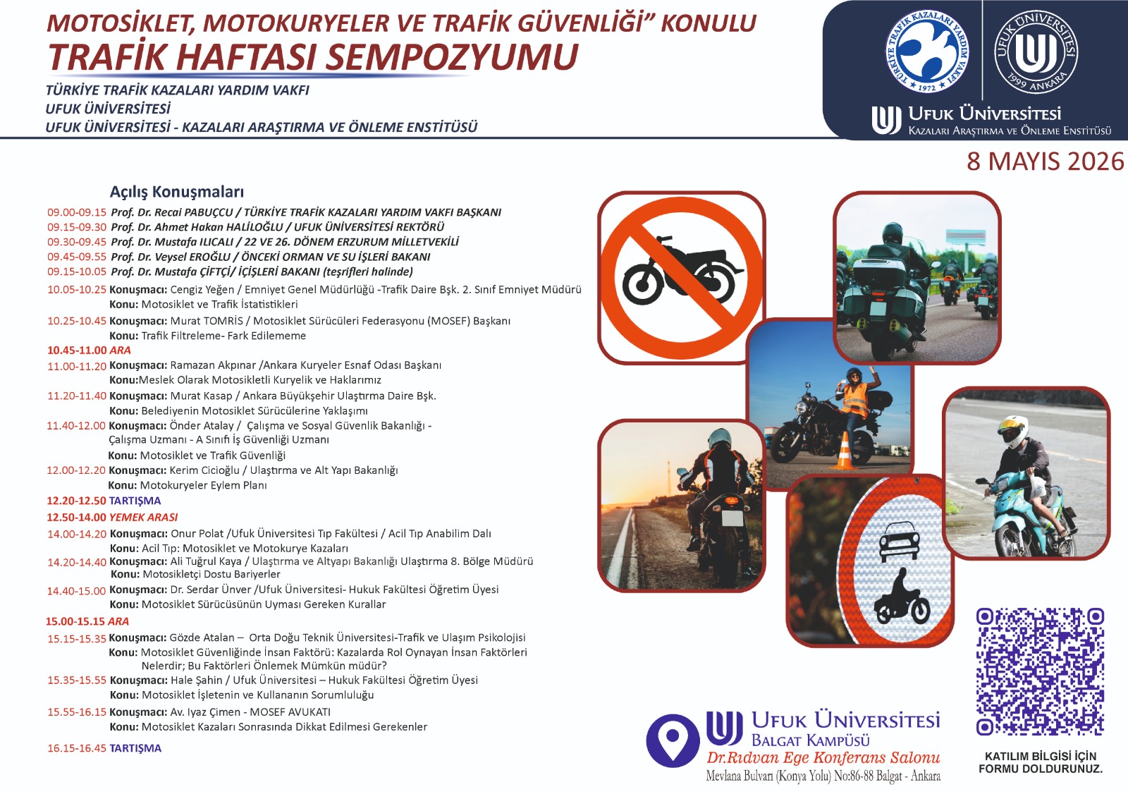 Çalıştay, Ufuk Üniversitesi Rektörü Prof. Dr. Ahmet Hakan HALİLOĞLU ve Türkiye Trafik Kazaları Yardım Vakfı Başkanı Prof. Dr. Recai PABUÇCU’nun açılış konuşmalarıyla başladı. Konuşmalarında, trafik kazalarının ülke genelindeki etkileri ve çözüm yolları vurgulandı.
